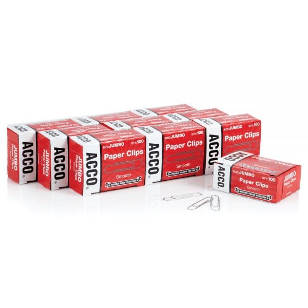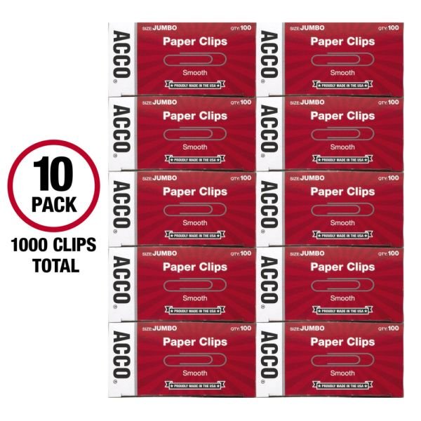 ACCO Economy Smooth Paper Clips, 1000 Total, Jumbo, Silver, 100 Per Box, Pack Of 10 Boxes