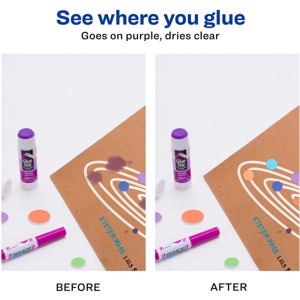 Confidently apply adhesive to every spot that needs it with Avery Disappearing Purple Glue Stics. Simply lift the cap and twist the base for easy application. Apply the right amount of adhesive with an easy-to-see purple glue that disappears once dry.