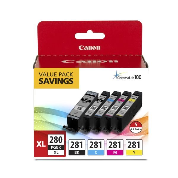 Canon PGI-280XL Black; CLI-281 Black; Cyan; Magenta; Yellow High-Yield Ink Tanks, Pack Of 5