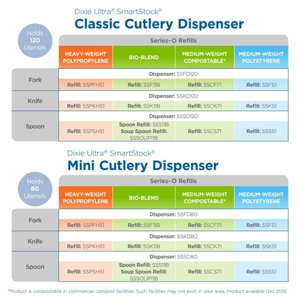 Sturdy cutlery provides reliable service. Sleek and efficient, Dixie Ultra SmartStock Plastic Cutlery Refills are ideal for Dixie Ultra SmartStock Dispensers (sold separately). Easy-to-load refills are pre-counted and pre-assembled, so restocking is quick and easy. Reduces usage on average by 29% compared to open bins. Hygienic design keeps utensils enclosed and helps protect from contaminants.