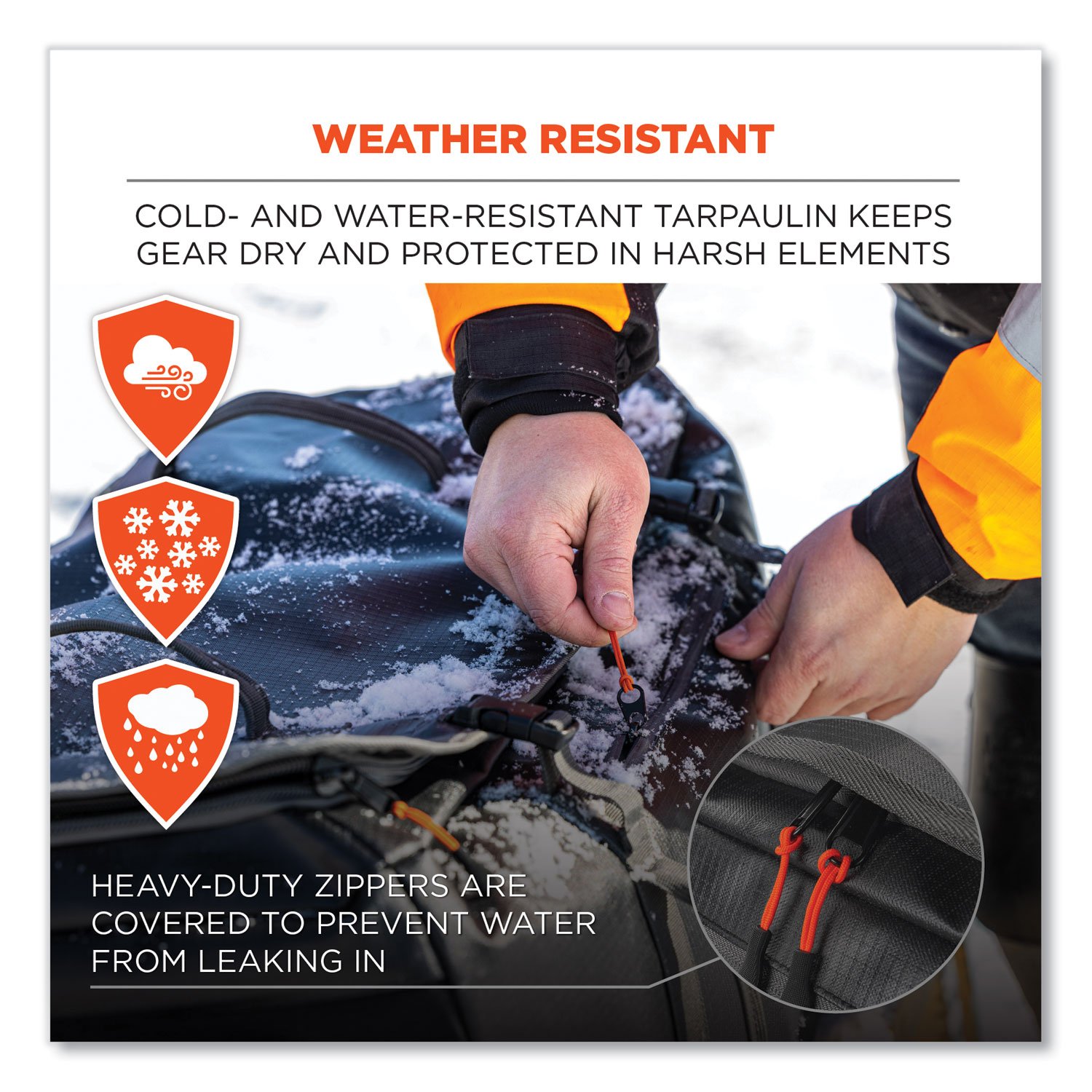 - Heavy-duty zippers covered by overhang to prevent water from leaking inside.