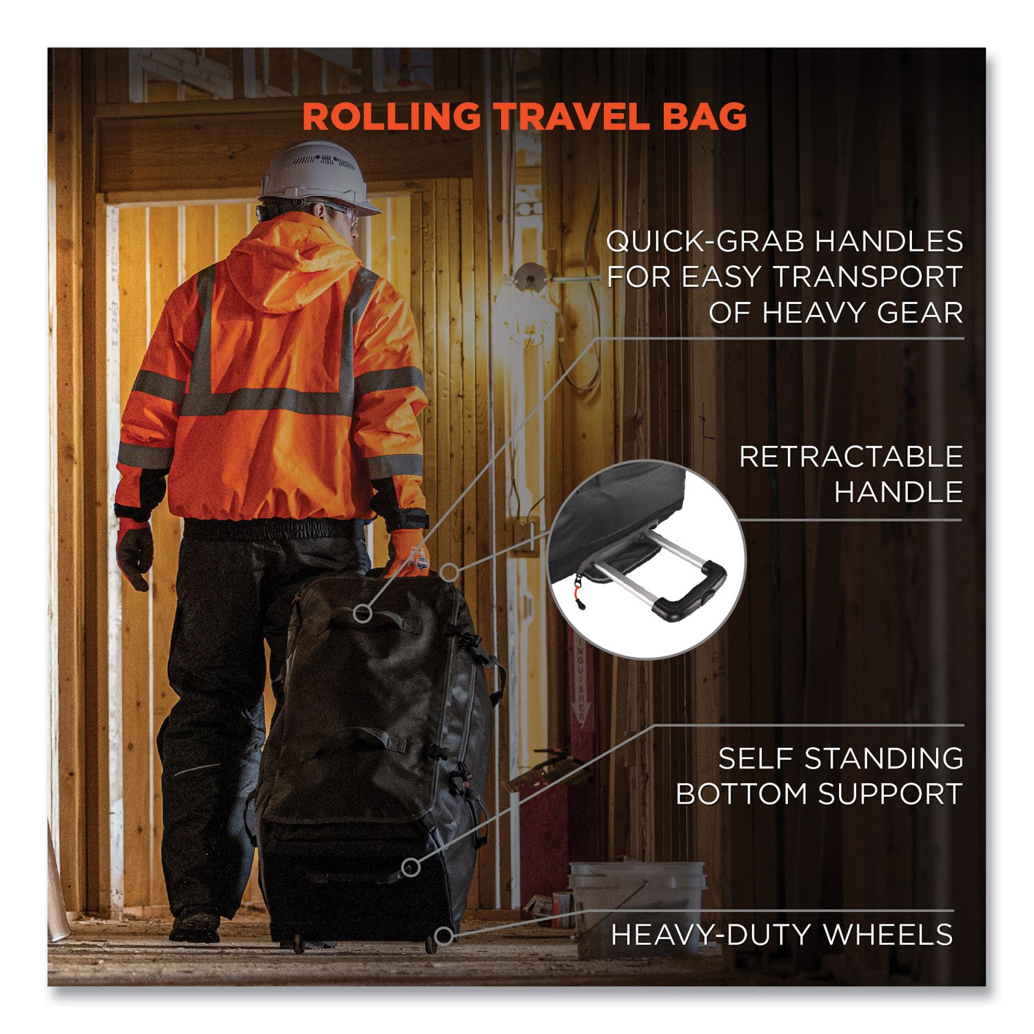 - Heavy-duty wheels, retractable handle and handle for easily transporting heavy gear.