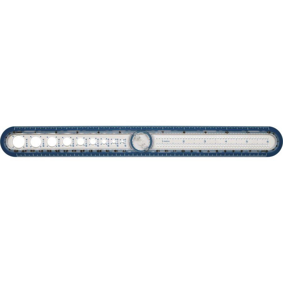 Circle Ruler with Integrated Circle Templates makes it easy to draw precise circles up to 12″ in diameter. It is the perfect tool for young students working on mastering geometry and angles. Unique product is much easier for young children to manipulate and use than a standard compass. Integrated design means that they can more easily understand how angles and measurements correspond with each other. To make larger circles with this innovative, three-in-one ruler and compass, simply place pen or pencil in the appropriate hole (1/8″ increments), hold the center disk and sweep the ruler around its center point. Smaller circles from 1/16″ to 9/16″ diameter are easily drawn with the integrated circle templates into the ruler body. Graduations up to 12″/30cm along the outer edge of the ruler are perfect for measuring.