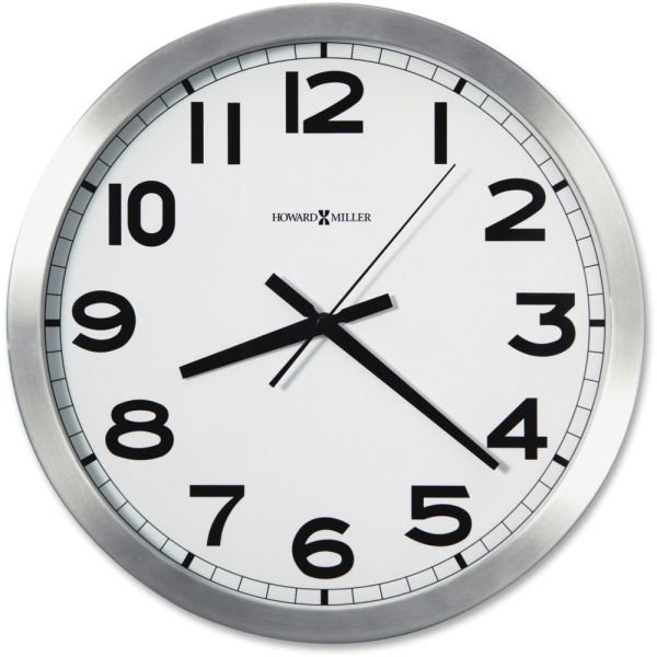 15-3/4″ brushed aluminum wall clock features a flat glass crystal over a white dial with black Arabic numerals.