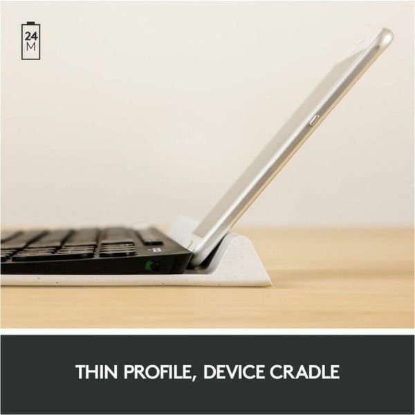 - Reliable Connectivity: Connect your device via Bluetooth or Unifying receiver; this keyboard also features an integrated rubber cradle that carefully holds various devices at a comfortable angle