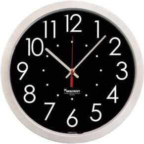 12-1/2″ wall clock features a contemporary, slimline design with a clear glass cover to add modern style to any room. Easy-to-read, 12-hour dial face allows easy viewing from anywhere in the room. Silent sweep movement eliminates any ticking sound for distraction-free use in quiet environments. Battery-operated clock requires one AA battery (sold separately). Clock is perfect for displaying in conference rooms, classrooms, lobbies, waiting areas and more.
