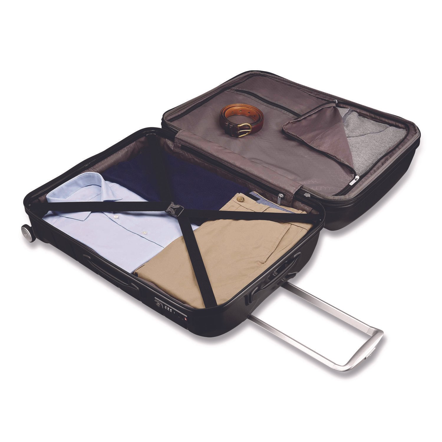 - Retracting top and side carry handles remain protected when checking baggage.