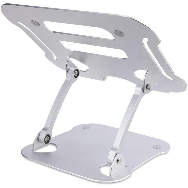 The laptop riser features a silver anodized finish with aluminum construction to ensure durability and sturdiness. The vented surface area is elevated to promote passive cooling and airflow. The space underneath the laptop platform can be used to store a keyboard, mouse, and/or other accessories and peripherals when they are not in use.
